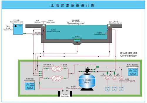 游泳池水質(zhì)處理系統(tǒng)遵從動態(tài)平衡工作原理,在循環(huán)處理過程中達到水質(zhì)的徹底凈化。游泳池水經(jīng)上溢流水道收集后匯集到平衡水池,會同補充水一起進入循環(huán)水管線,在循環(huán)水泵驅(qū)動下流...
